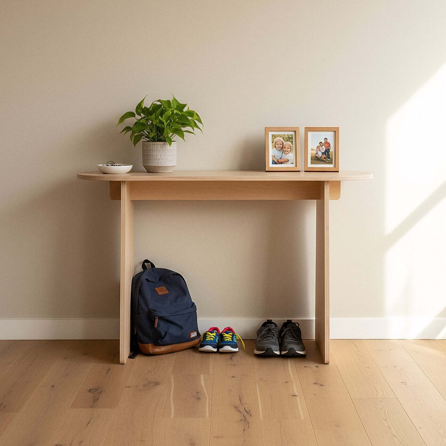 The UNFNSHED Modern Console Table is built for entryways, hallways, and behind-the-sofa placement. The slim profile gives you surface space without eating into your room. Made from Baltic birch plywood with tool-free assembly — snap the legs in and you are done.
